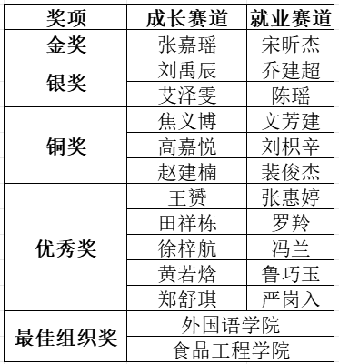 l过Ȁ烈角逐,大赛p选出成长赛道、就业赛道各金奖1名、银?名、铜?名、优U?名;评选出优秀l织?个。具体名单如下: