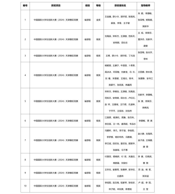 q日Q天z市教育委员会发布了2024q全国大学生大赛天|赛区竞赛10赛事获奖通知Q我校学子奋勇拼搏,不负众望Q在多项学科竞赛中展现出良好的实践能力和创新素养Q又取得丰硕佳WQ学校共?46名学生获奖,其中Q?/span>获得“中国国际大学生创新大赛Q?024Q天z赛区竞赛”金?V银?V铜?3;“天z市W十七届大学生工业与艺术设计竞赛”获一{奖5,二等?,三等?0;“全国大学生q告艺术大赛天|赛区竞赛”获三等?;?024q全国大学生市场调查与分析大赛天z赛区竞赛”获三等?;?024q天z市普通高校大学物理竞赛”获得二{奖1,三等?;?024q天z市普通高校大学数学竞赛”获优秀?,?024q全国新工科本科生毕业设计大赛”获优胜?,以上赛事创历史最好成l?/span>
